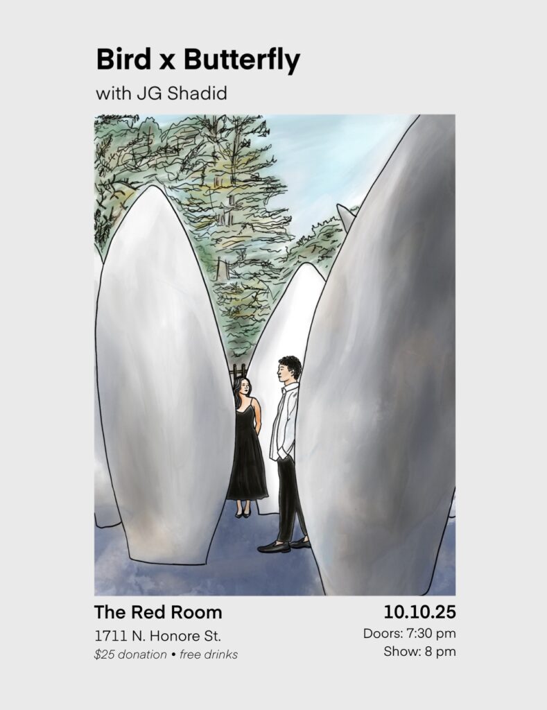 7:30 doors / 8:00 p.m. show – JG Shadid opens (8:00) followed by Bird x Butterfly (8:30)